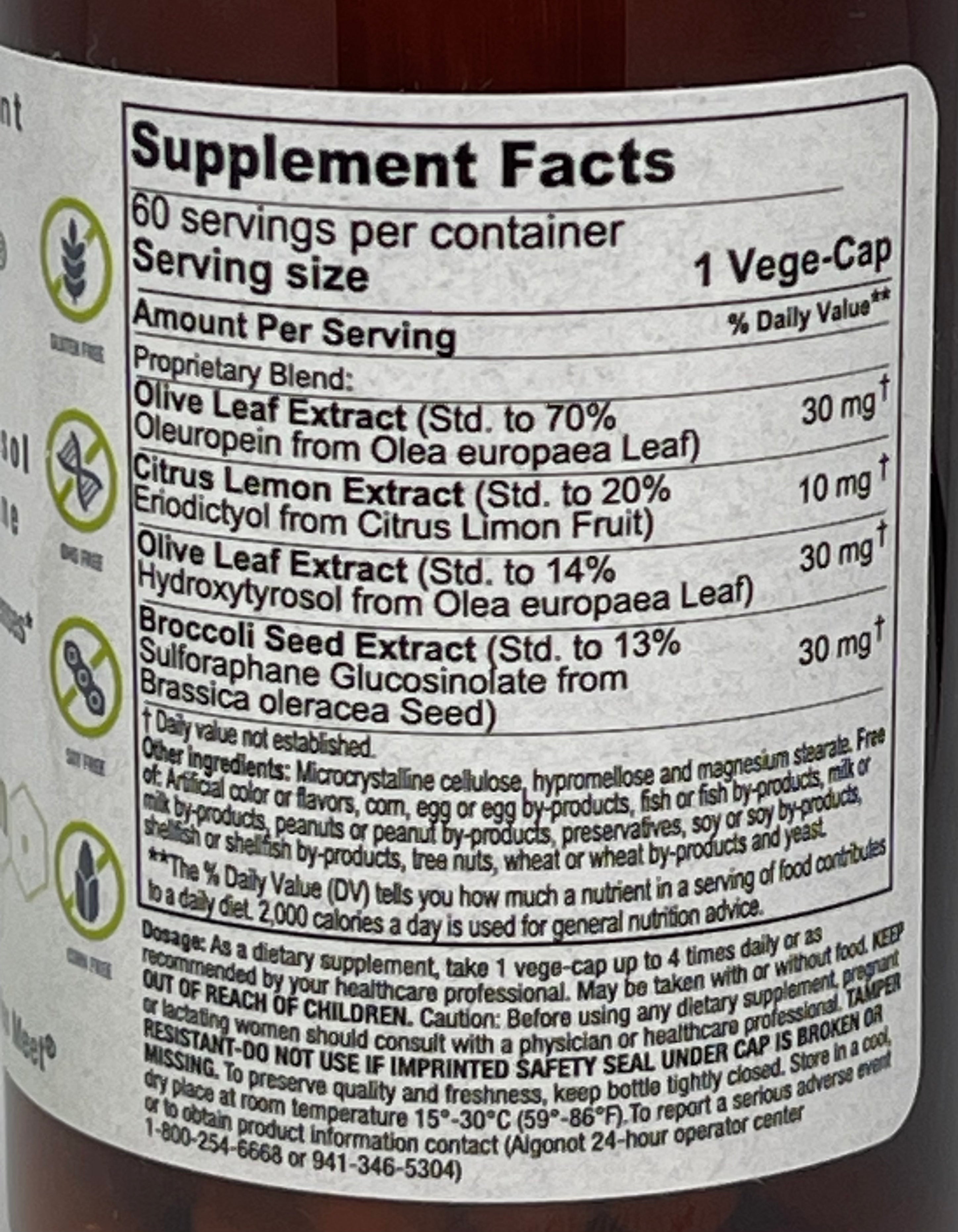 ViralProtek ® is the only dietary supplement with purified ingredients from olive leaf, broccoli and citrus limon, recently documented to have antiviral and anti-inflammatory properties. ViralProtek ® is formulated in vegetarian capsules. ViralProtek ® is a unique, patented all-natural oral dietary supplement in veggie capsules that may promote the body’s defenses. ViralProtek ® uses an exclusive combination of natural ingredients, based on published research. Unique to ViralProtek ® are the polyphenols oleuropein and eriodictyol. ViralProtek ® is FREE of: Artificial colors or flavors, corn, egg or egg by-products, fish or fish by-products, milk or milk by-products, peanut or peanut by-products, preservatives, soy or soy by-products, shellfish or shellfish by-products, tree nuts, wheat or wheat by-products and yeast.